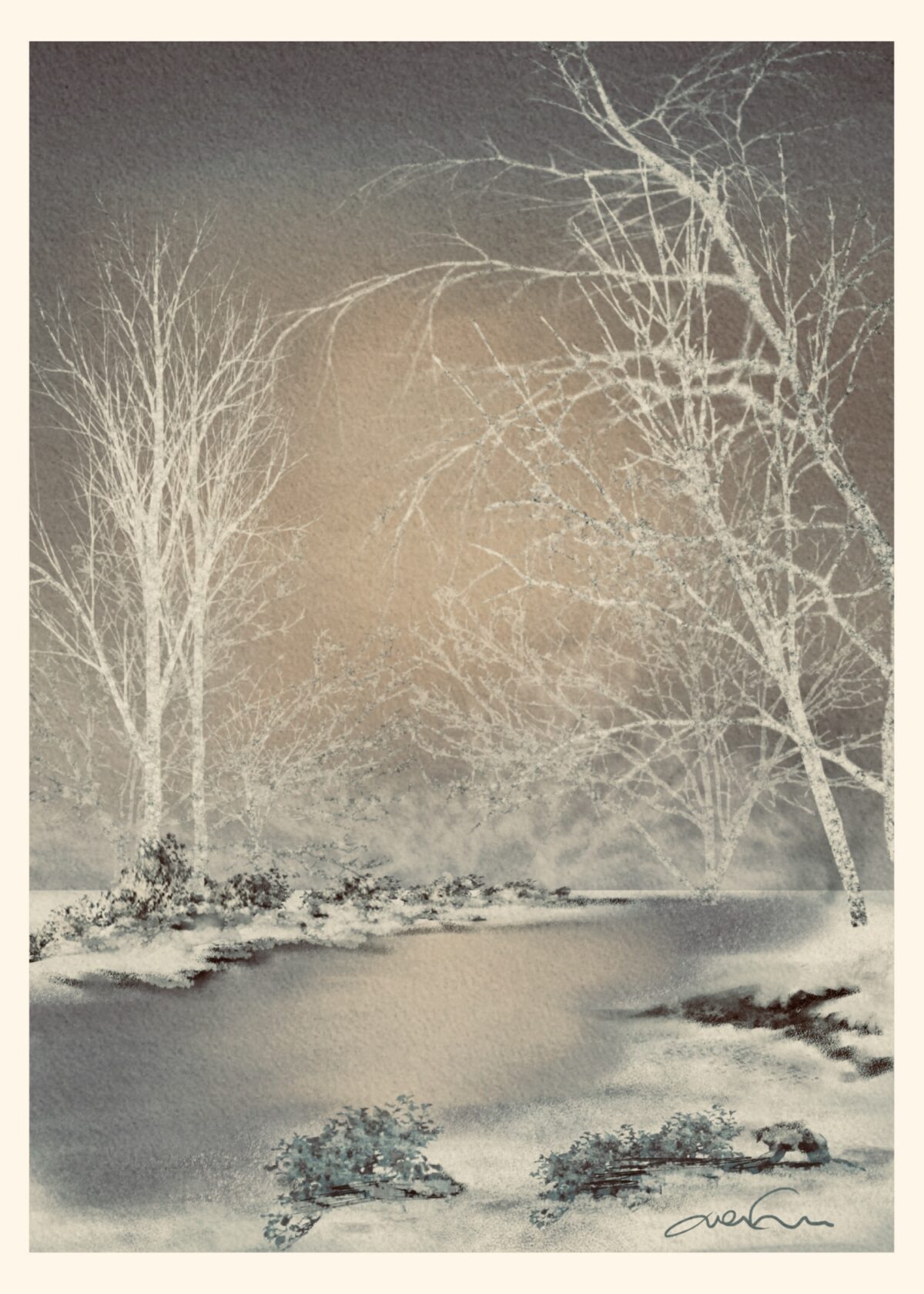 La noirceur s’est installée tôt avant le souper. La neige est invitante…dans mon dessin d’il y a quelques années. Après un élagage imposant des couches de dessin, j’ai légèrement modifié l’équilibre des couleurs. Tableau numérique 5 x 7.