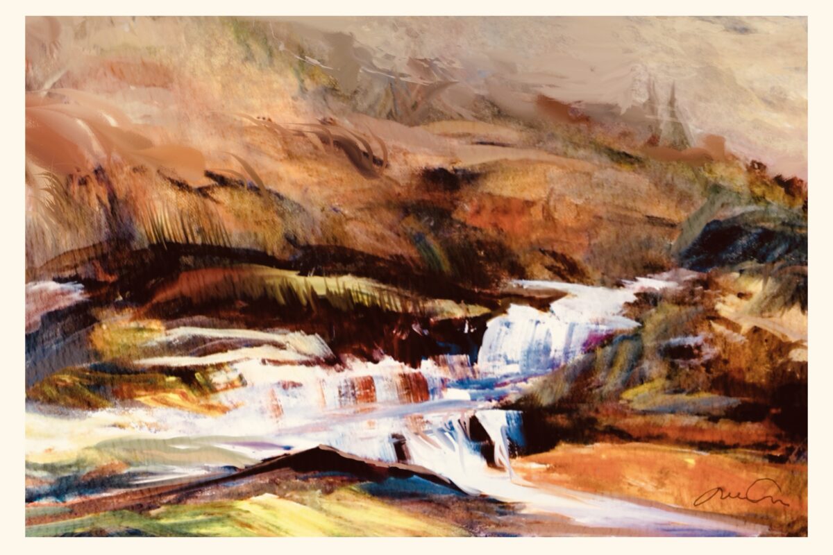 Ce dessin est un remake d’un tableau édité au début de 2021. Je l’ai remanié de fond en comble. Les berges du ruisseau sont plus importantes, la maison de campagne n’y est plus, les buissons sont plus nombreux et les conifères sont moins flous. En fin de compte, le centre d’intérêt est maintenant le ruisseau. Tableau numérique 12 x 12.