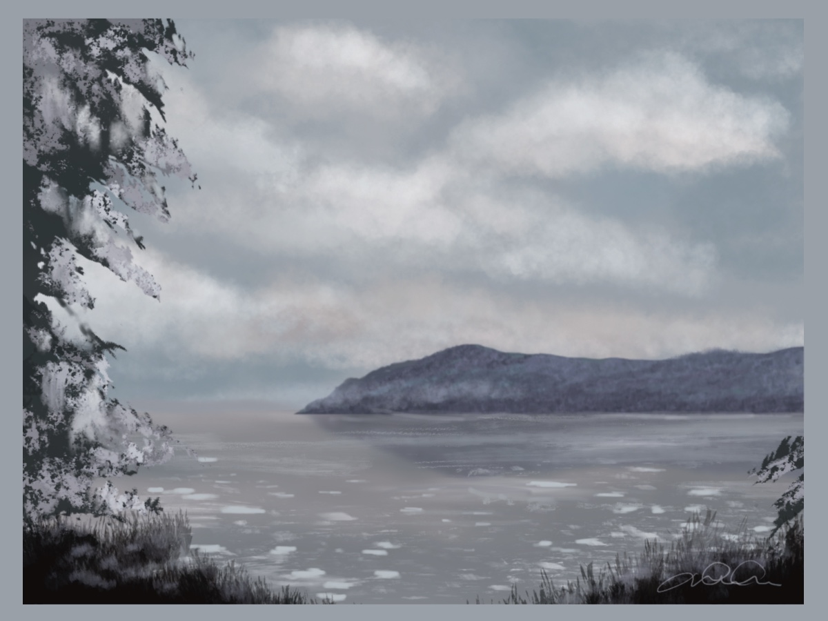 Après plus de 25 ans en vacances automnales dans la région de Baie-Saint-Paul, la montagne située à l’ouest de la baie révèle un autre aspect à l’hiver. La photo de référence provient de notre généreuse locatrice. Tableau numérique 4 x 3.