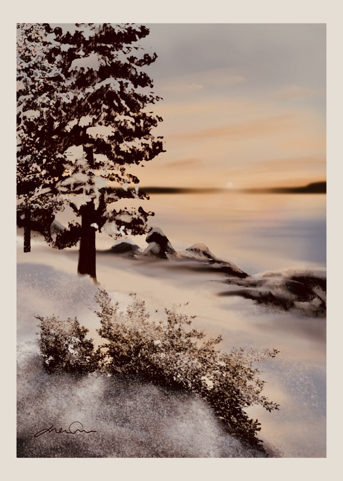Encore un rajeunissement d’un tableau réalisé il y a 3 ans. Après avoir repoussé le grand conifère, j’ai mieux defini le sentier et j’ai ajusté des ombrages derrière les roches au bord de l’eau. Enfin, j’ai retravaillé les contrastes et la présentation globale. Tableau numérique 5 x 7.