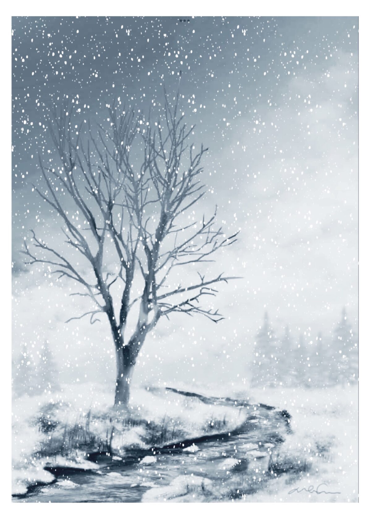 Par ces temps-ci, il fait très froid, trop froid. Ce vieux dessin est toujours évocateur. Après quelques retouches et l’ajout d’une averse de neige, il est encore pertinent. Tableau numérique 5 x 7.