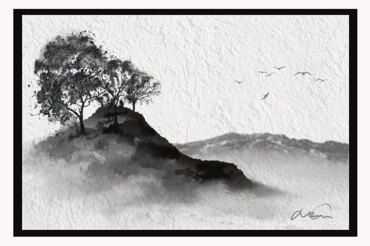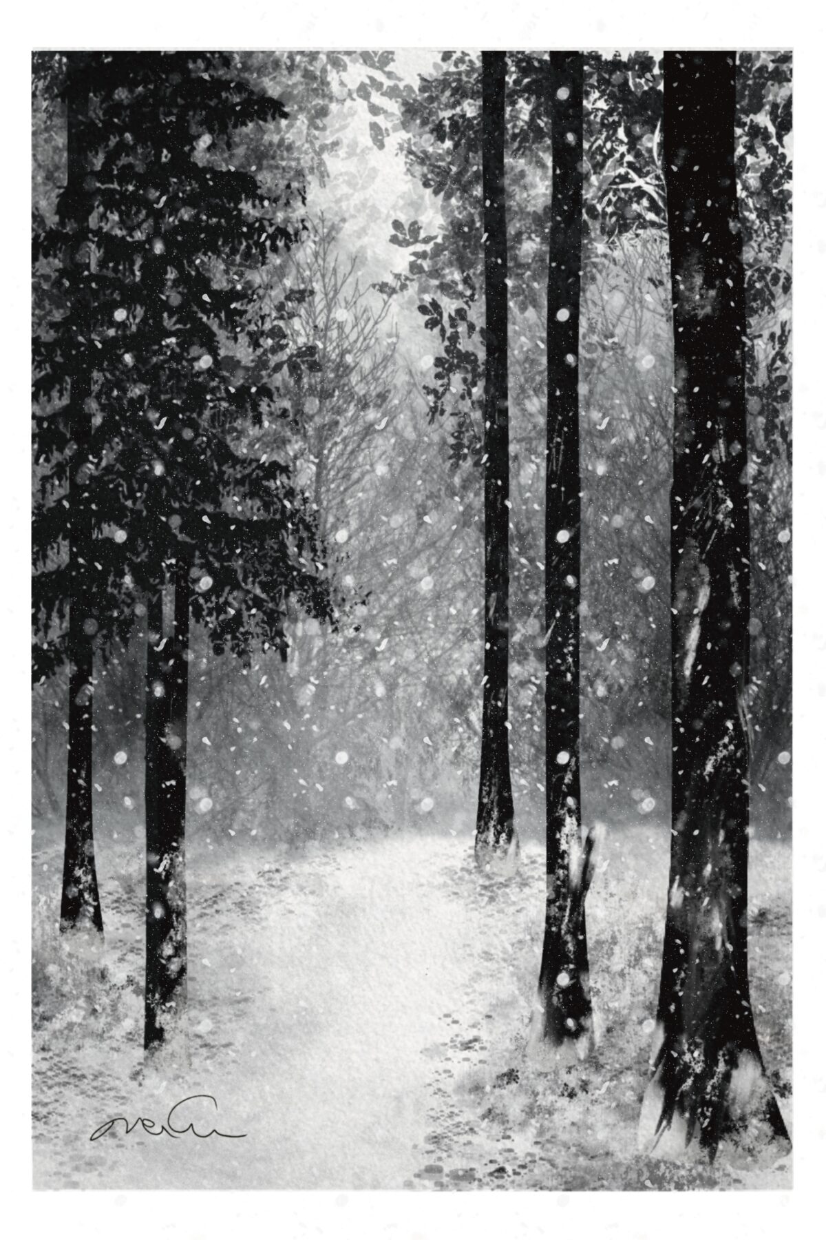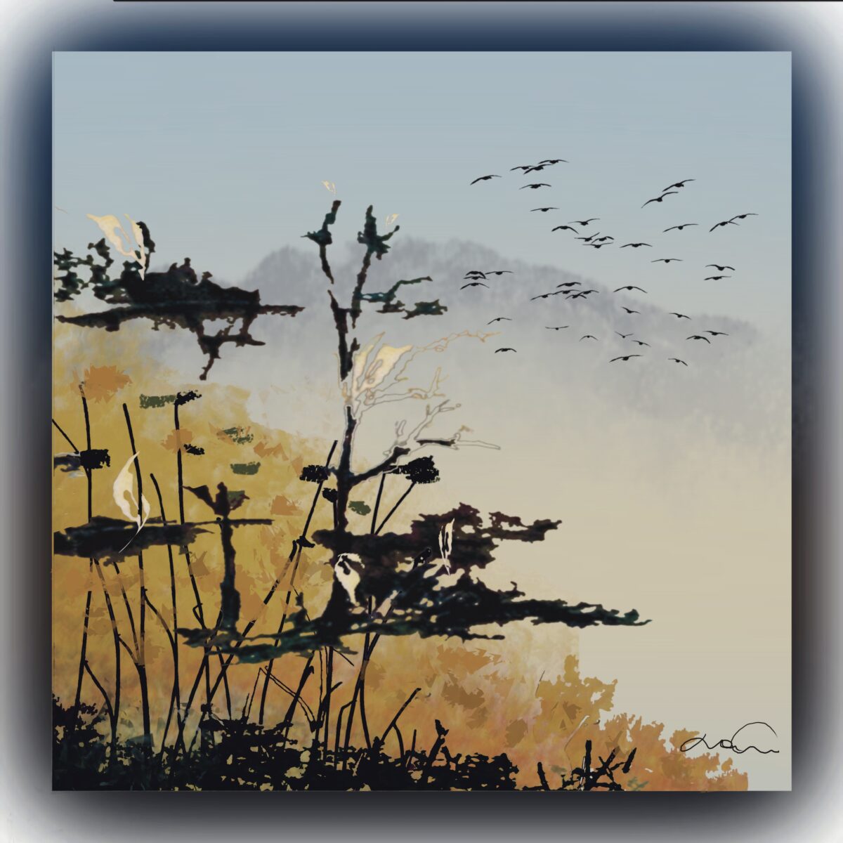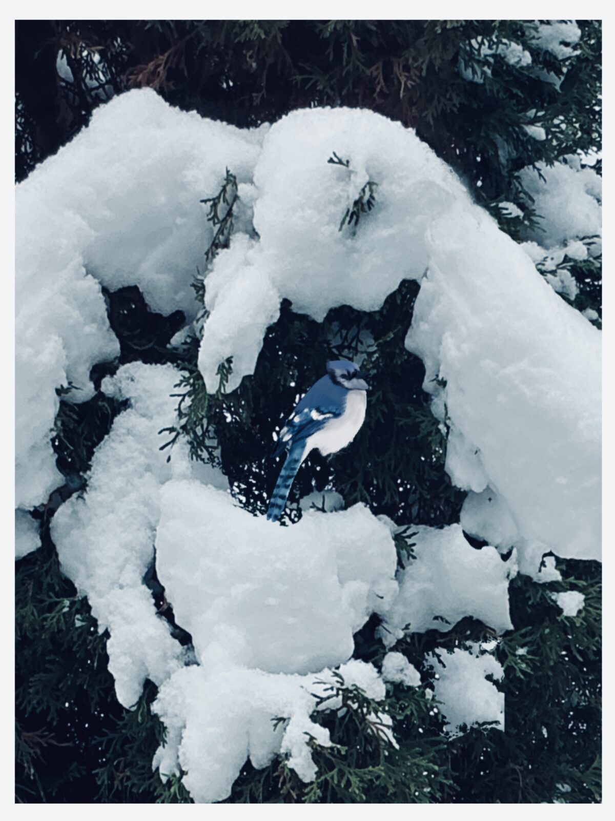Entre la photo numérique et la peinture numérique, il n’y a qu’un pas si on utilise une application à cette fin. Ce tableau est une photo d’un amas de neige sur des thuyas auquel j’ai ajouté un peu de neige numérique pour former une couronne. Le geai bleu au centre de cette couronne est un dessin réalisé dans un tableau antérieur. Tableau numérique 6 x 8.